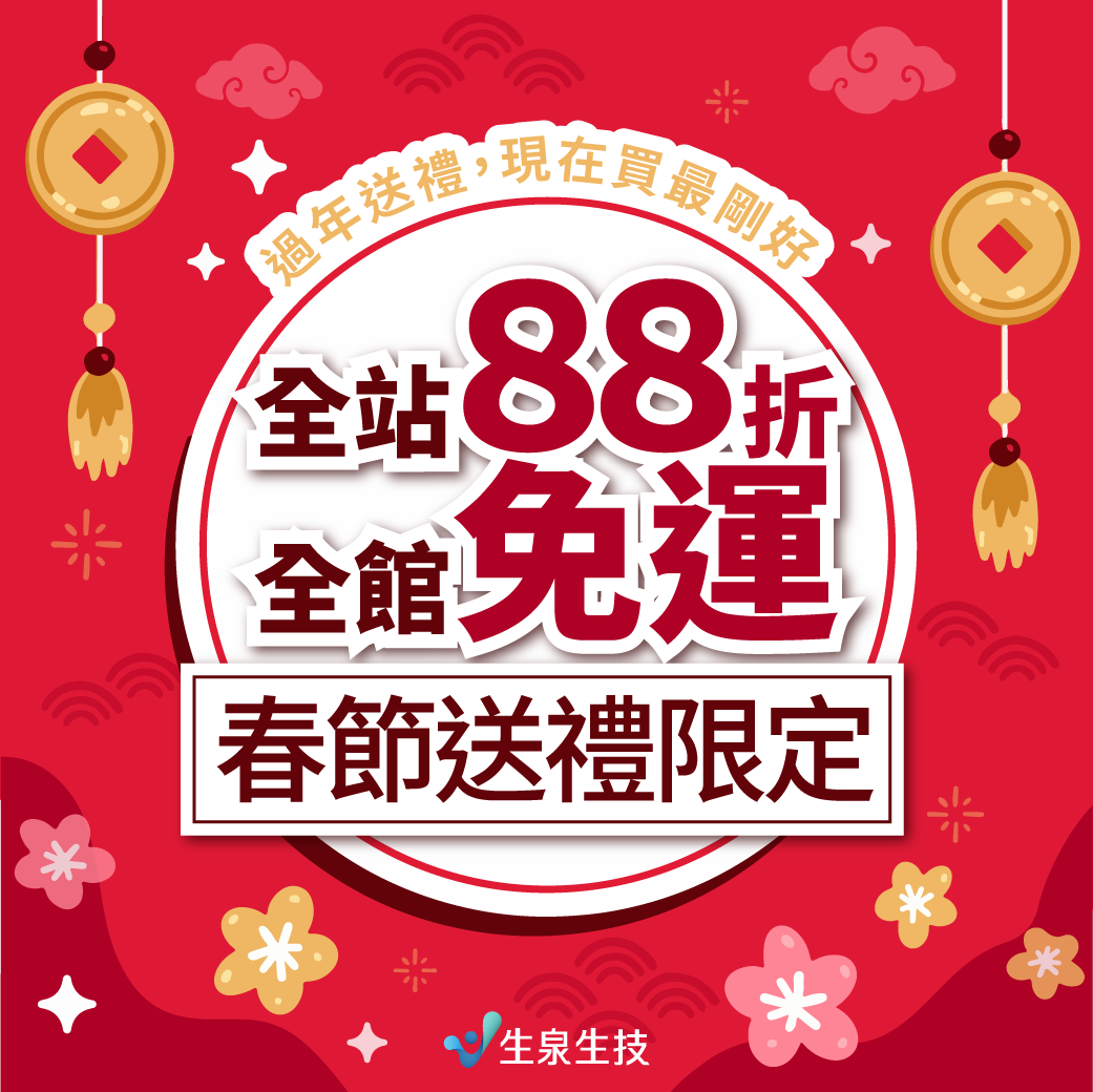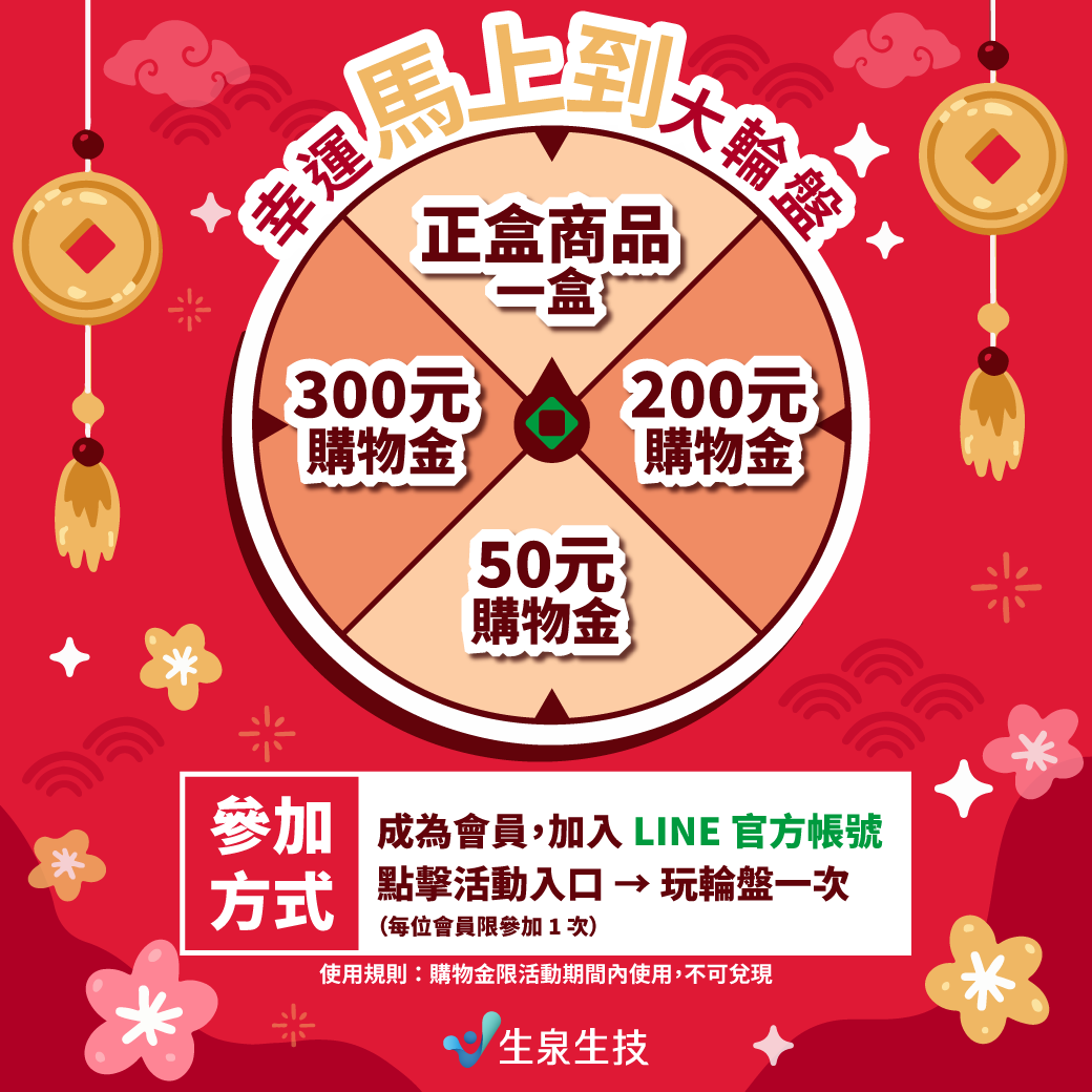 生泉生技特別推出年節限定優惠活動,不只全站折扣、全館免運,還加碼 LINE 專屬「會員回娘家拿紅包」輪盤活動,讓會員輕鬆把紅包帶回家。