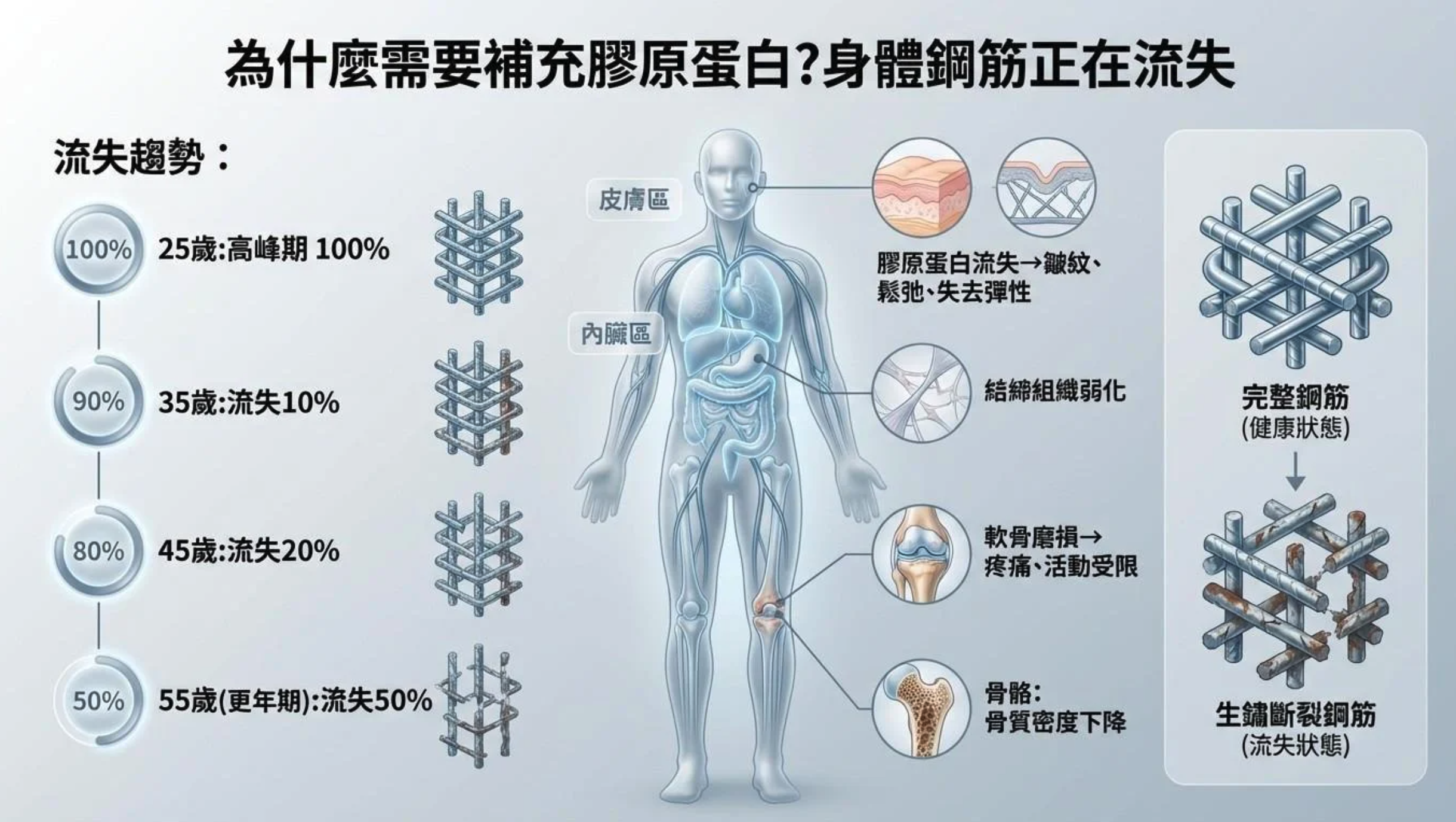 軟骨本身缺乏血管供應,其修復仰賴周邊環境與體內代謝狀態。一旦修復速度降低,加上日常活動所帶來的反覆負荷,長期下來便容易產生結構性的改變。同時,膠原蛋白作為維持組織彈性與支撐的重要成分,其生成效率也會隨年齡而減緩,進一步影響關節的穩定性與緩衝能力。