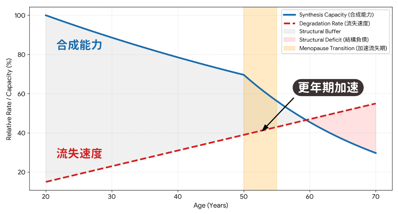 示意圖:人體膠原蛋白合成與流失趨勢對比