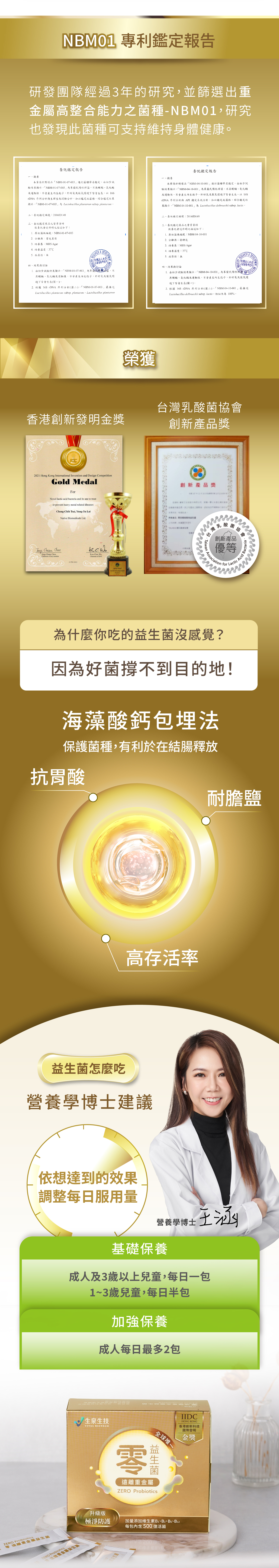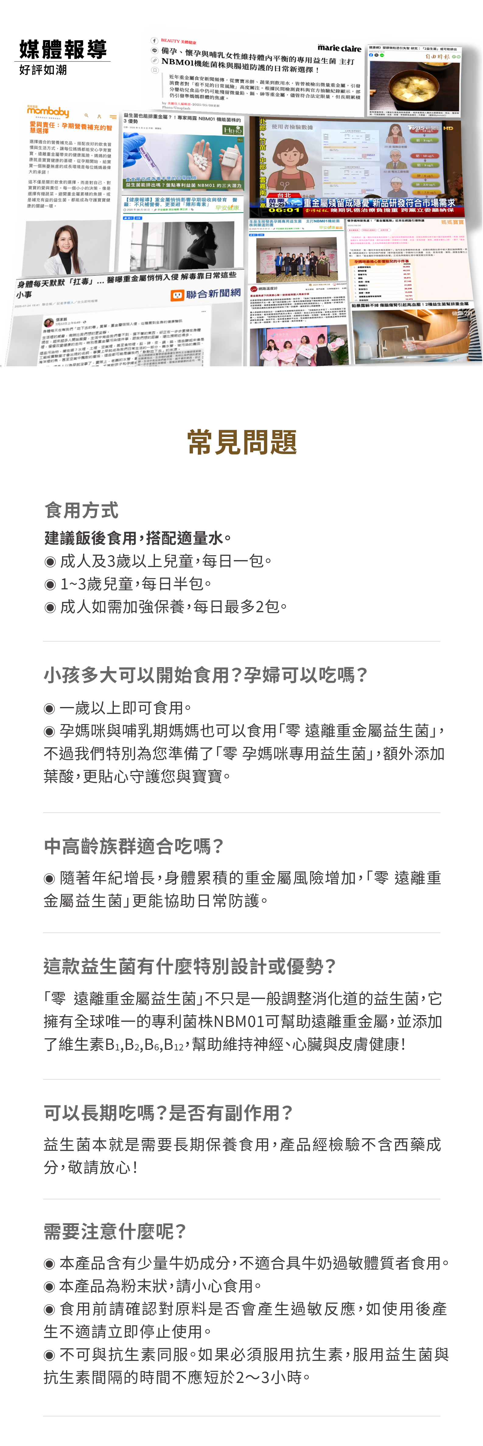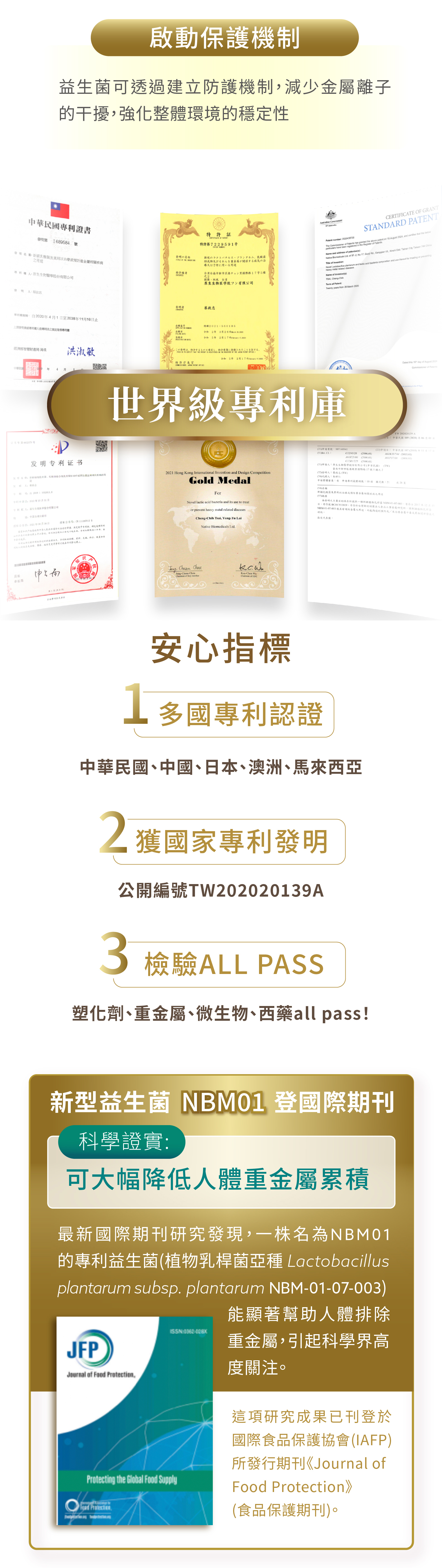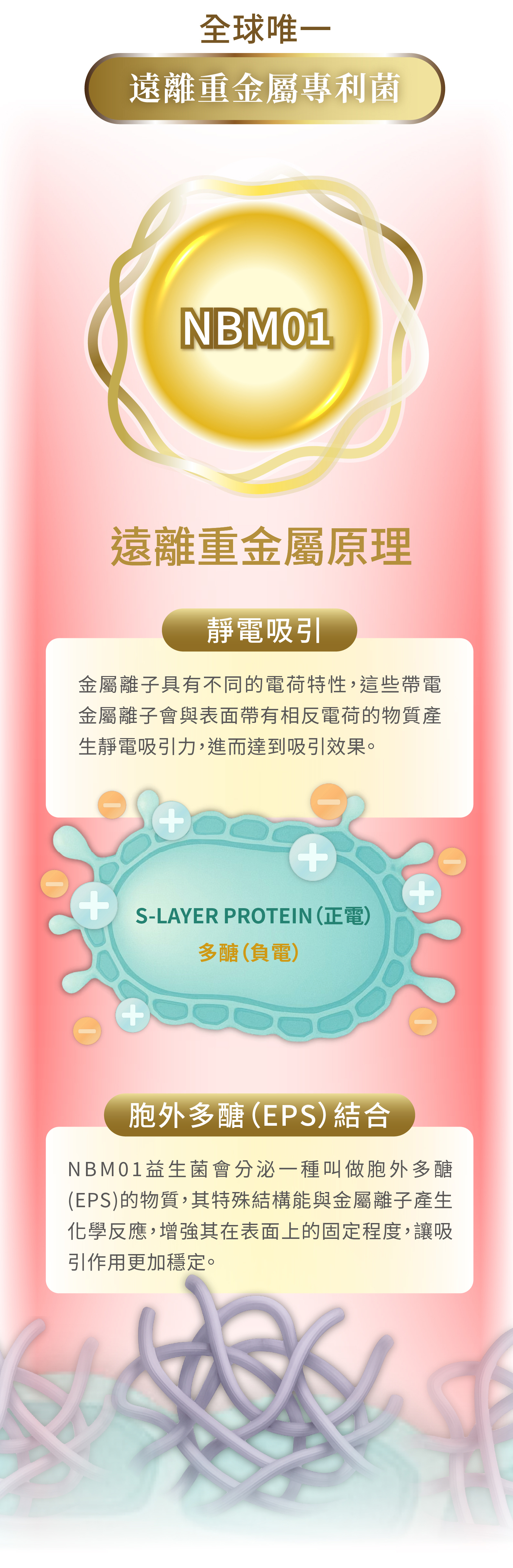 • NBM01 專利菌株,業界唯一幫助遠離重金屬、營養補給、促進新陳代謝